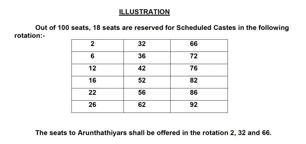 * கூடுதல் எண்ணிக்கையில் தகுதியான அருந்ததியர்கள் இருந்தால், 3% உள் ஒதுக்கீட்டு இடங்களுக்கு மேற்பட்டு உள்ள அனைத்து SC இடங்களுக்கும் அவர்கள் போட்டியிடலாம். அதே போல், போதுமான எண்ணிக்கையில் தகுதியான அருந்ததியர் இல்லாவிட்டால், அந்த இடங்கள் அதே ஆண்டு மற்ற SC சாதியினருக்கு வழங்கப்படும்.