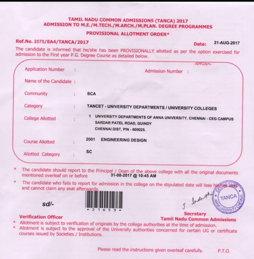 அருந்ததியர் மாணவர் ஒருவர் பட்டியல் இன இட ஒதுக்கீட்டில் மேற்படிப்பு பெற்ற ஆதாரம்