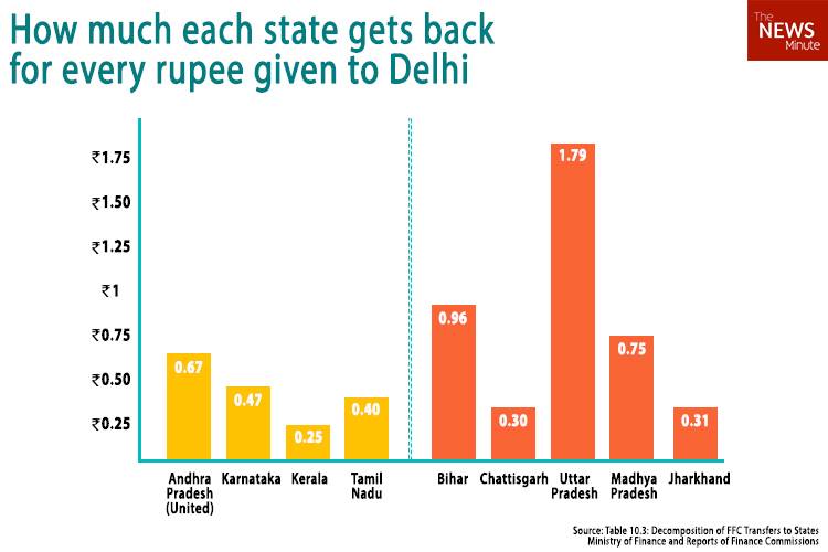 தமிழ்நாடு இந்தியாவுக்குக் கட்டும் ஒரு ரூபாய் வரியில் 40 பைசா தான் திரும்பி வருகிறது. உத்திர பிரதேசத்துக்கு அதுவே 1 ரூபாய் 79 காசாக கிடைக்கிறது.