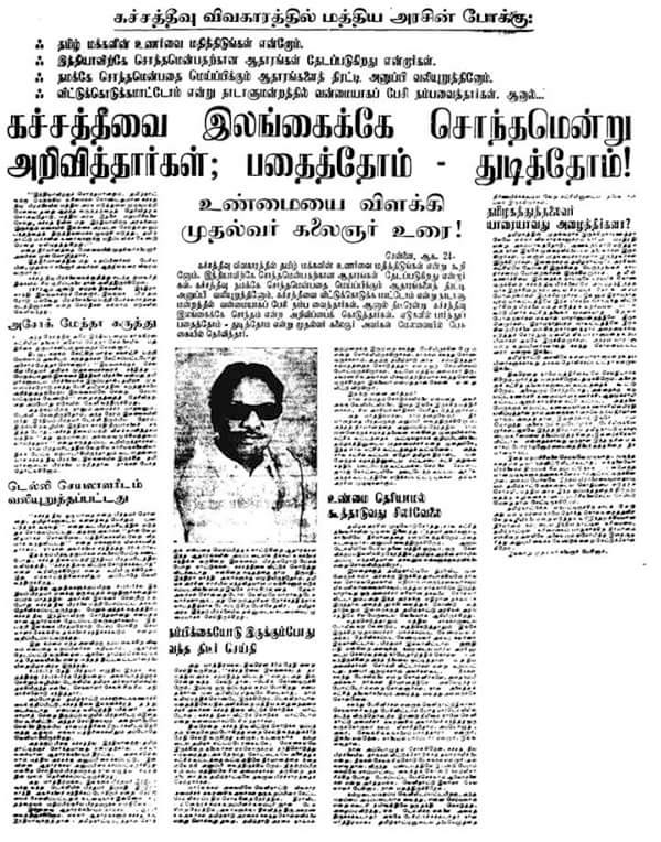 இதில் கலைஞர் தன்னுடைய கோரிக்கைகளை, கண்டனங்களை, எதிர்ப்புகளை மத்திய அரசிடம் எந்தளவிற்குக் கொண்டு செல்ல முடியுமோ அந்தளவிற்குக் கொண்டு சென்றார். ஆனால் இந்திராகாந்தி சில அரசியல் ஆதாயங்களுக்காக தமிழர்களுக்குத் துரோகம் செய்து விட்டு சர்வாதிகாரப்போக்கோடு கச்சத்தீவை இலங்கைக்குத் தாரைவார்த்துவிட்டார்.