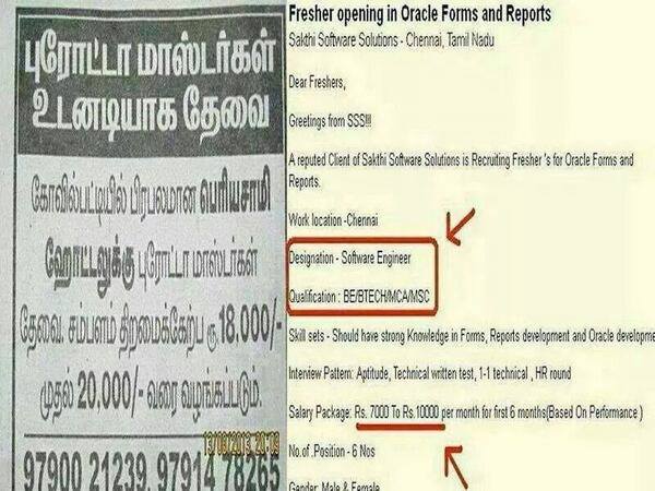கல்லூரியை விட்டு வெளியே வரும் ஒரு பொறியாளருக்கு ரூ. 10,000 என்பது மிக நல்ல சம்பளம். பத்து ஆண்டுகள் பொறியாளராக பணியாற்றி நகரத்தின் சிறந்த பொறியாளர் ஆனால் இலட்சக்கணக்கில் சம்பளம் வாங்கலாம்.