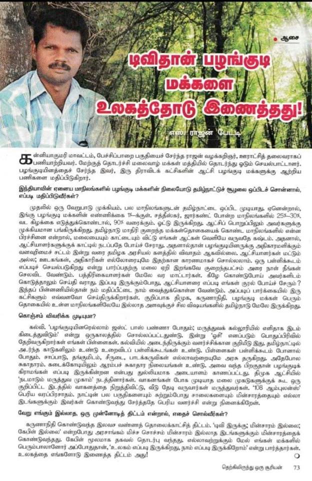 கிராமப்புற, ஏழைகளுக்கும் பெண்களுக்கும் உலகைத் திறந்த விட்டது கலைஞர் தந்த தொலைக்காட்சி. November 7, 2018 பழங்குடிகளுக்கு மட்டும் அல்ல, என் அம்மாவைப் போன்ற படிப்பறிவற்ற, கிராமப்புற, ஏழைகளுக்கும் பெண்களுக்கும் உலகைத் திறந்த விட்டது கலைஞர் தந்த தொலைக்காட்சி. பார்க்க… முகநூல் உரையாடல்
