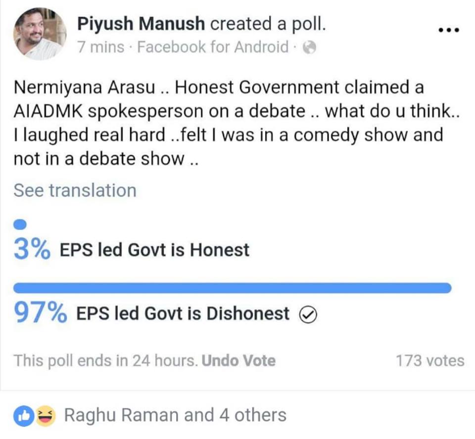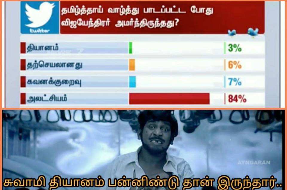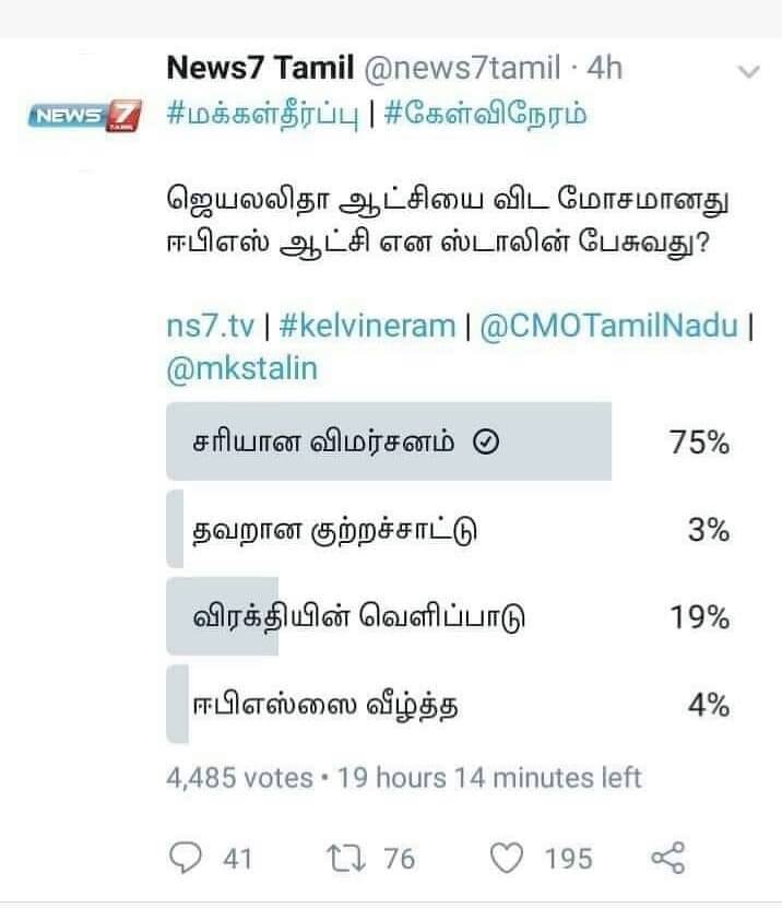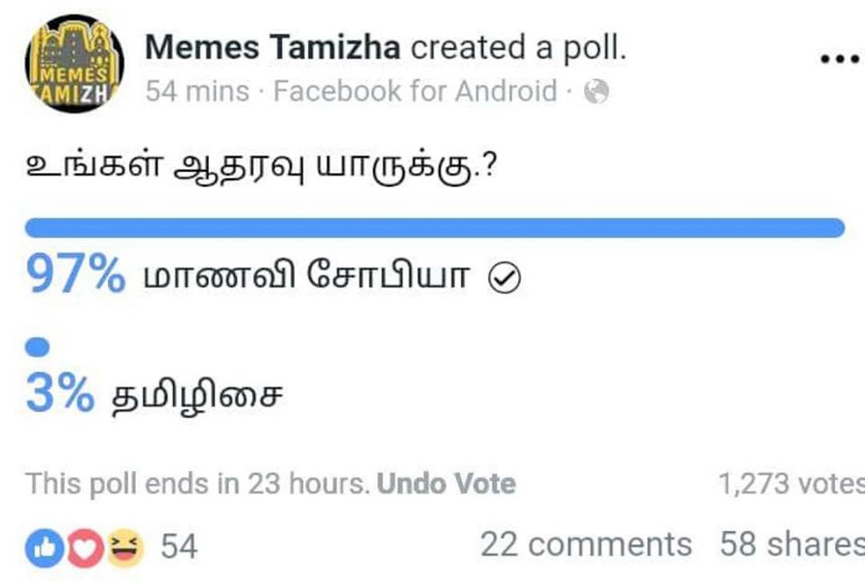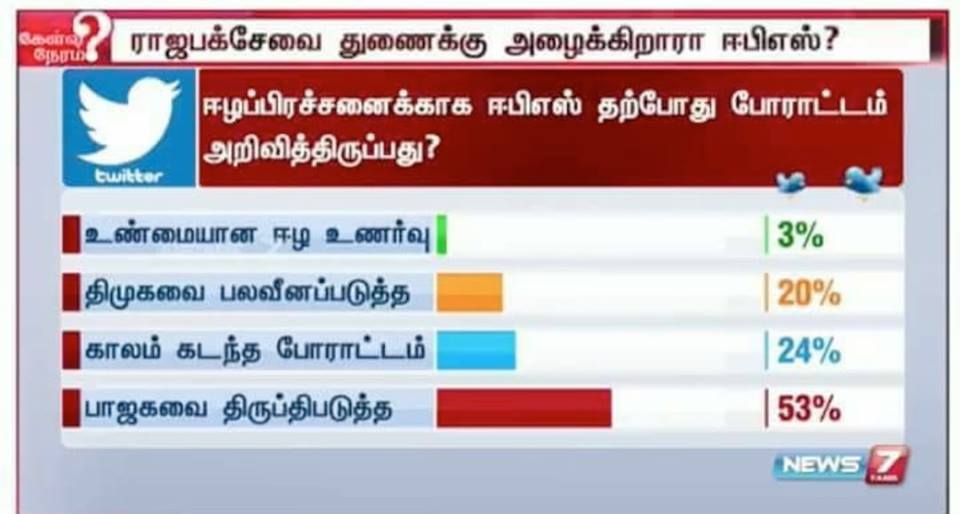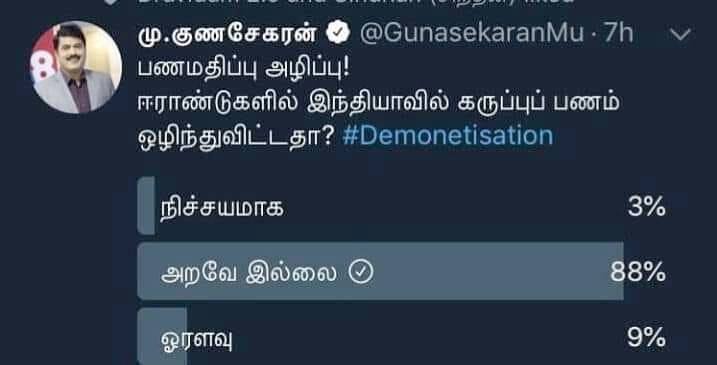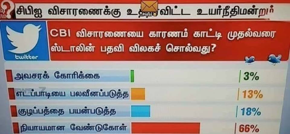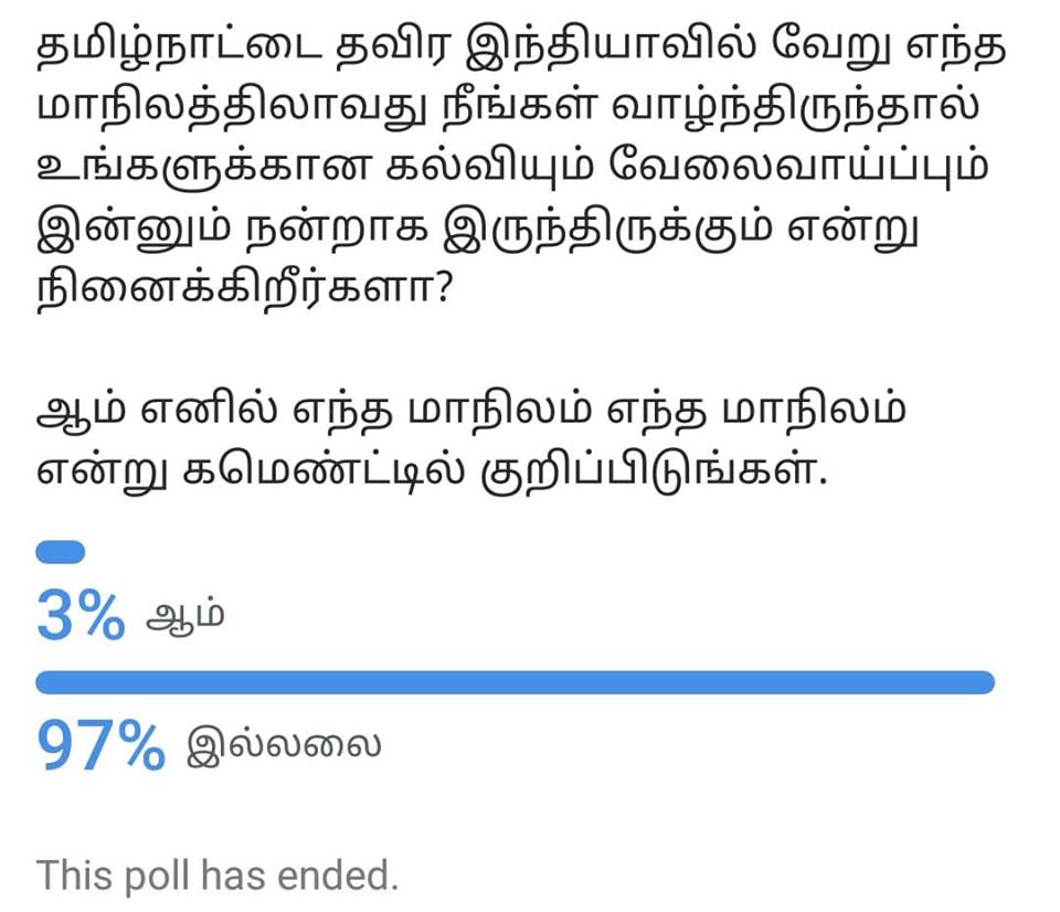 இங்கே உள்ள வாக்கெடுப்பு முடிவுகளைப் பாருங்கள். தமிழகத்தின் மனநிலைக்கு எதிரான, நாட்டுக்குக் கேடு விளைவிக்கும் அனைத்து நிலைப்பாடுகளுக்கும் 3% ஆதரவு தொடர்ந்து தென்பட்டுக் கொண்டே இருக்கிறது . அவர்களிடம் தான் கண்ணுக்குப் புலப்படாத அதிகாரமும் குவிந்திருக்கிறது.