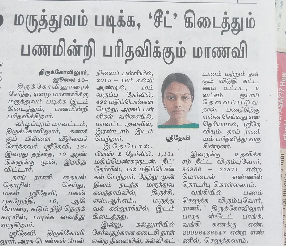 இப்போது மருத்துவம் படித்து முடிக்க குறைந்தது 30 இலட்சம் தேவை.