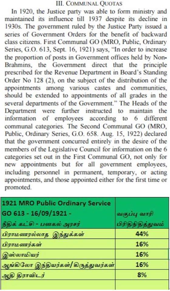 1921. எடுத்த எடுப்பிலேயே பார்ப்பனர் அல்லாத இந்துக்கள், இசுலாமியர், கிறிஸ்தவர், ஆதி திராவிடர் என்று ஒவ்வொரு வகுப்புக்கும் இட ஒதுக்கீடு கேட்டது தான் திராவிட வரலாறு.